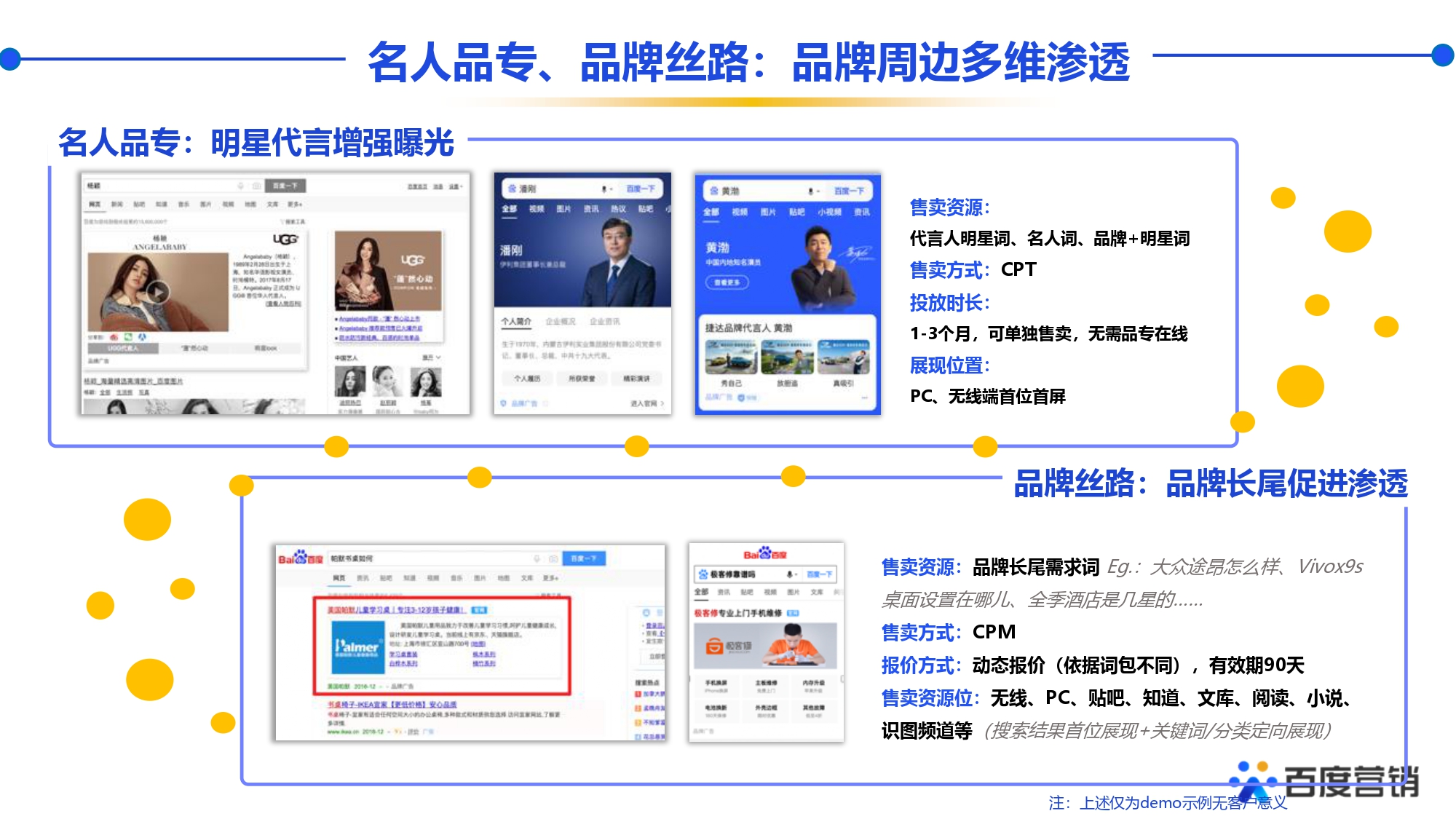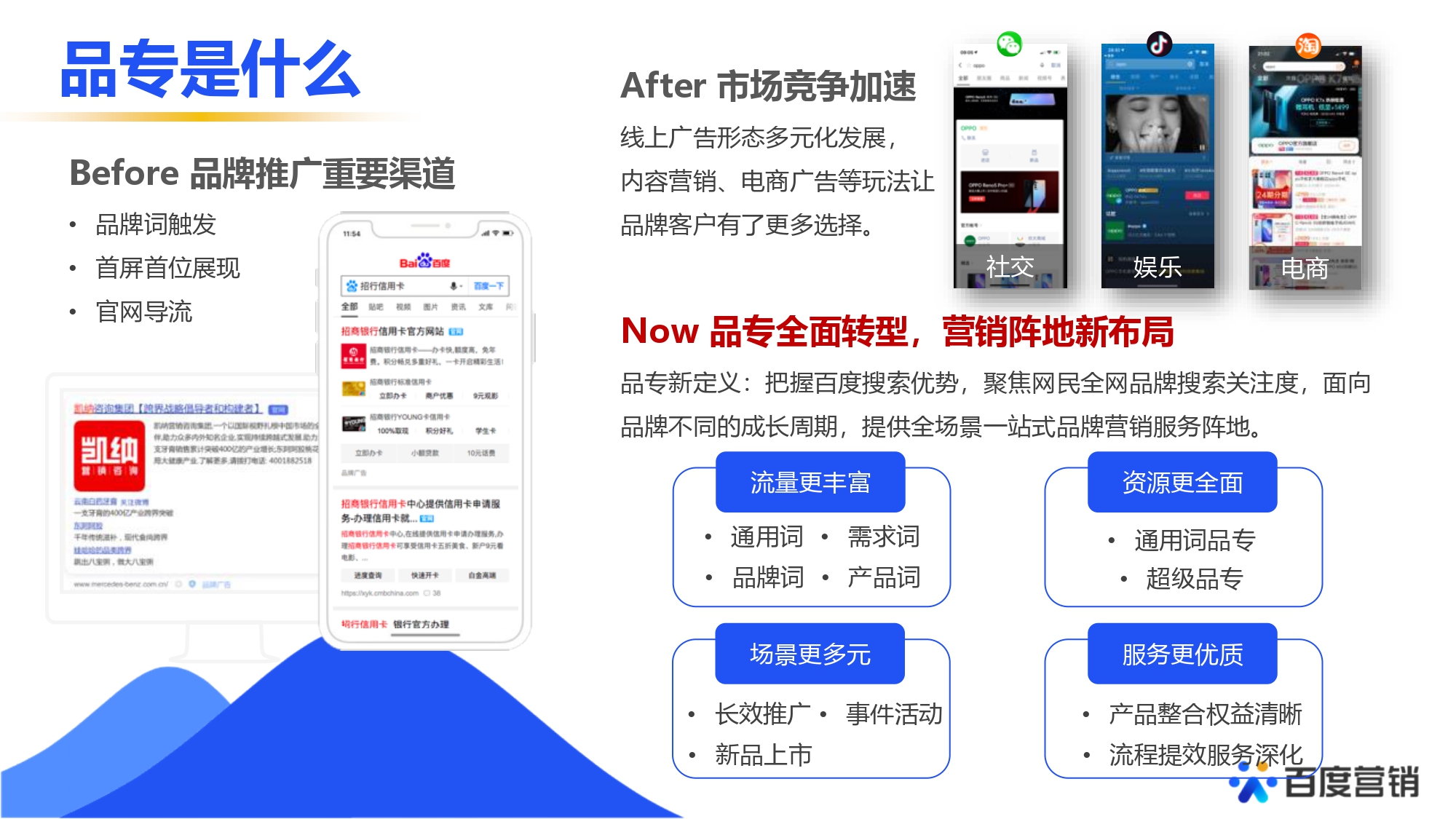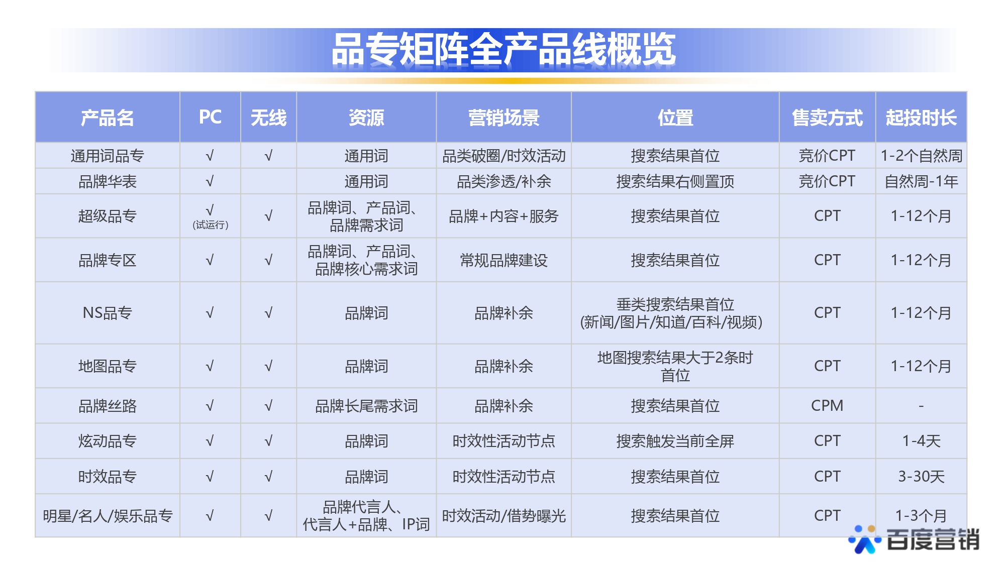 百度搜索品牌廣告新的打開方式,面向品牌客戶的CPM廣告產品,預算更靈活,資源更豐富,全面覆蓋百度6類場景和27個產品(含搜索首位)。