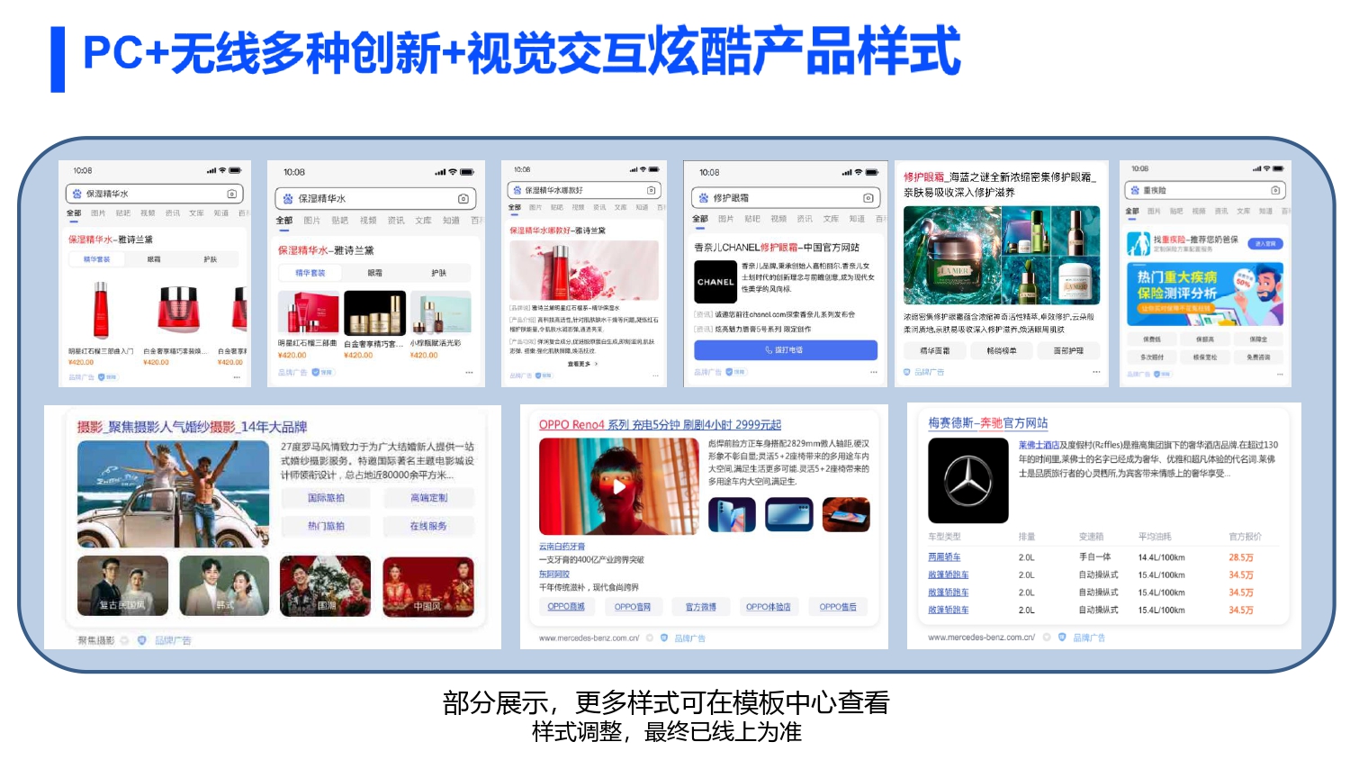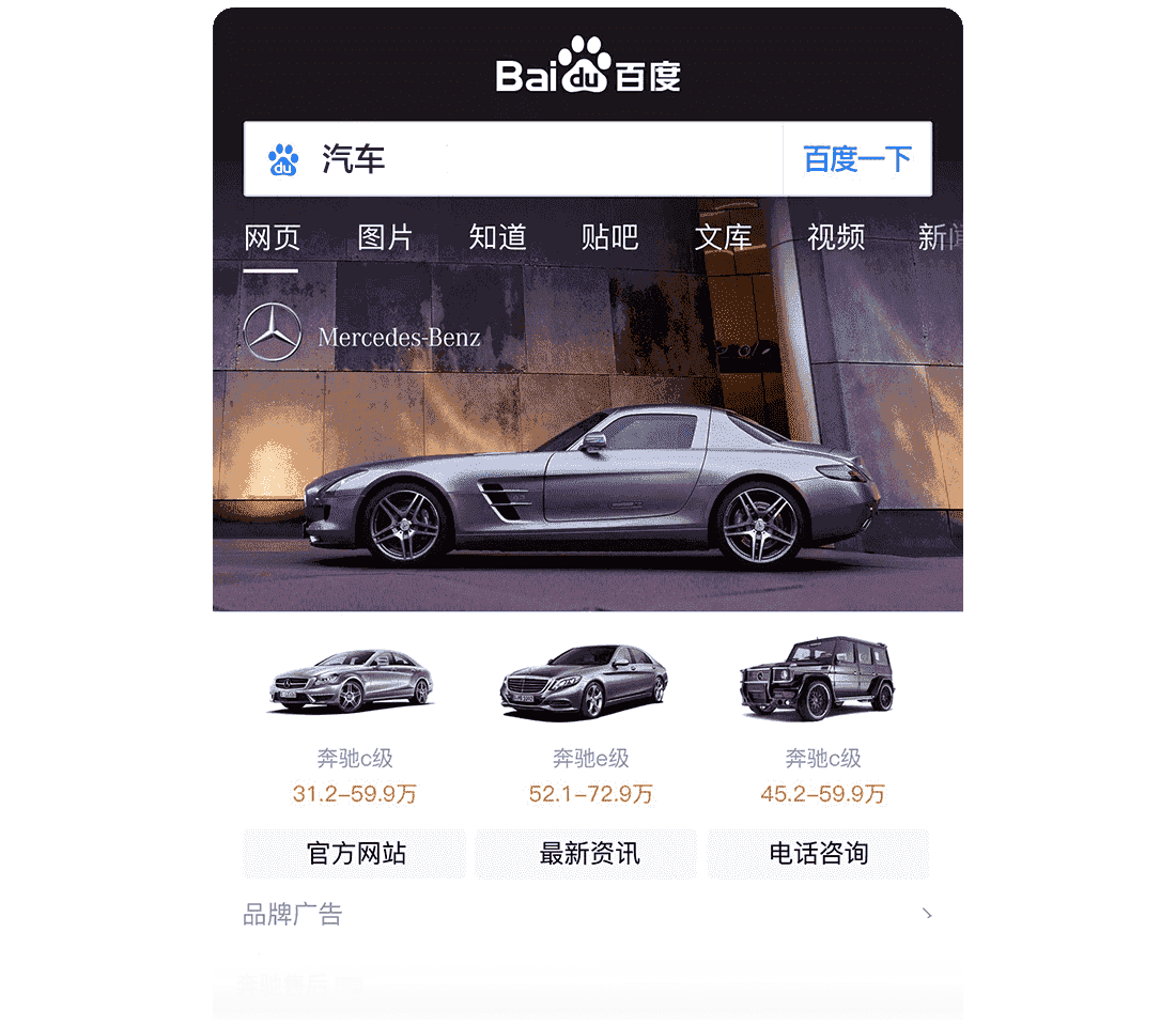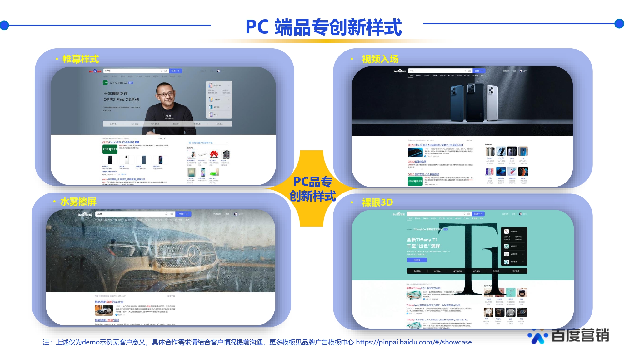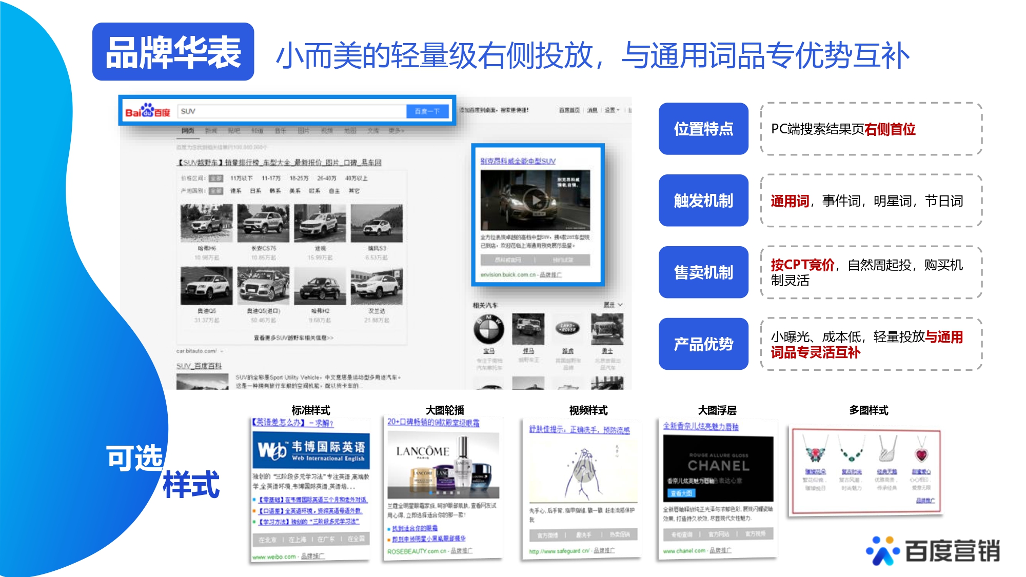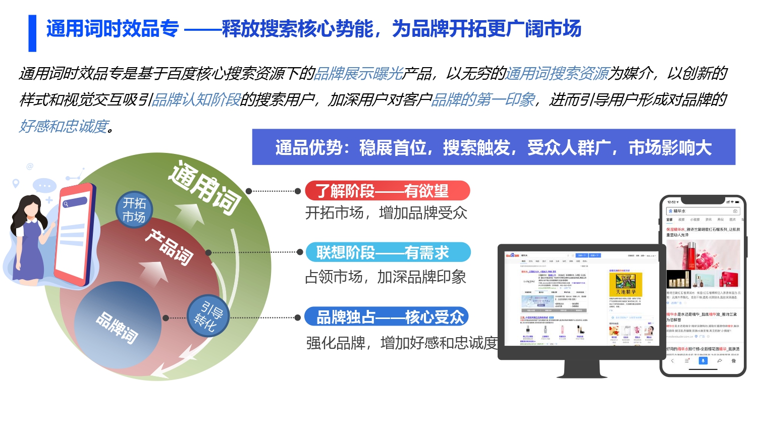 品牌展示曝光產品,以百度最海量的通用詞搜索資源為媒介,以創(chuàng)新的樣式和視覺交互吸引品牌認知階段的搜索用戶,加深用戶對客戶品牌的第一印象,進而引導用戶形成對品牌的好感和忠誠度。