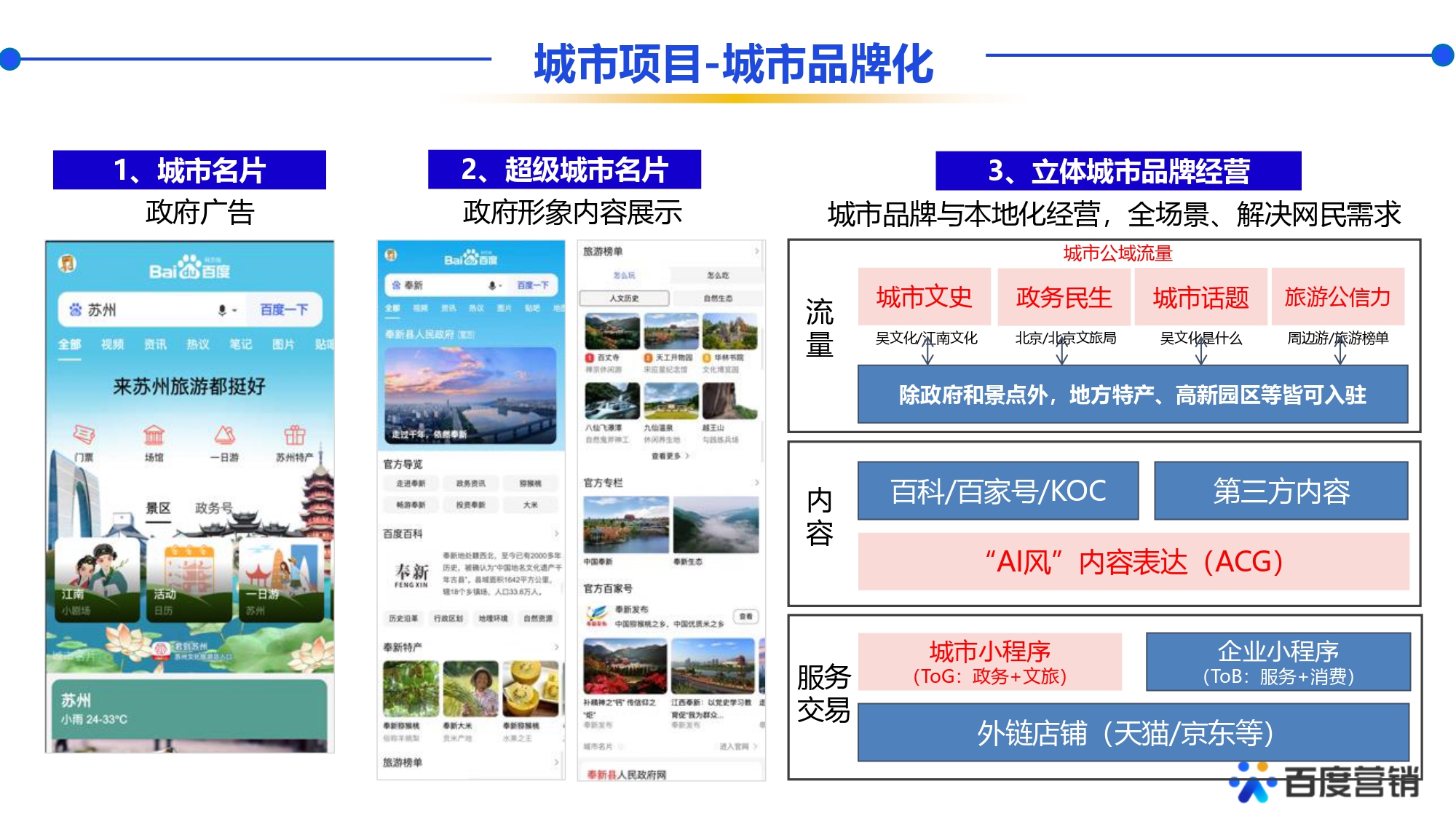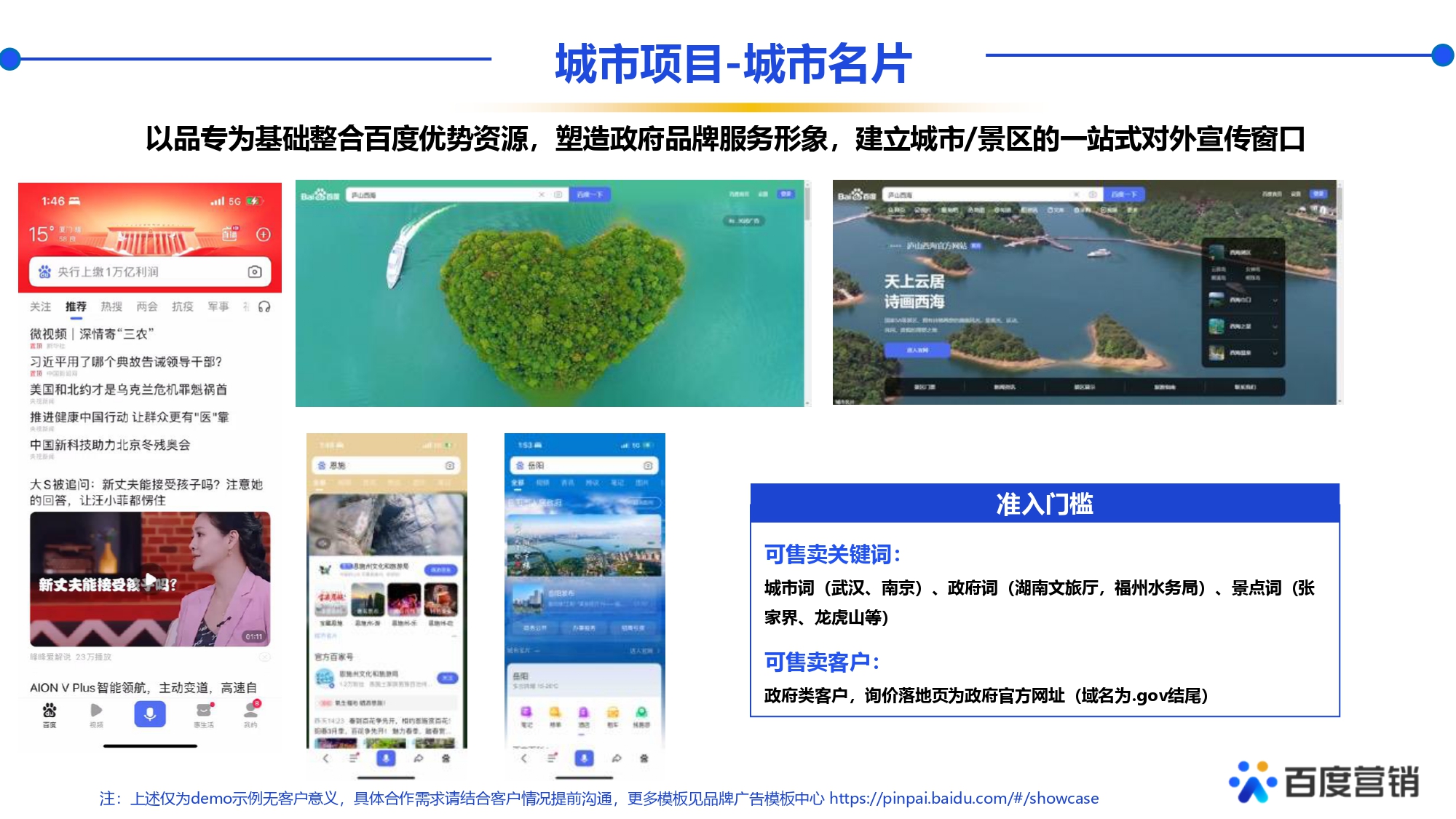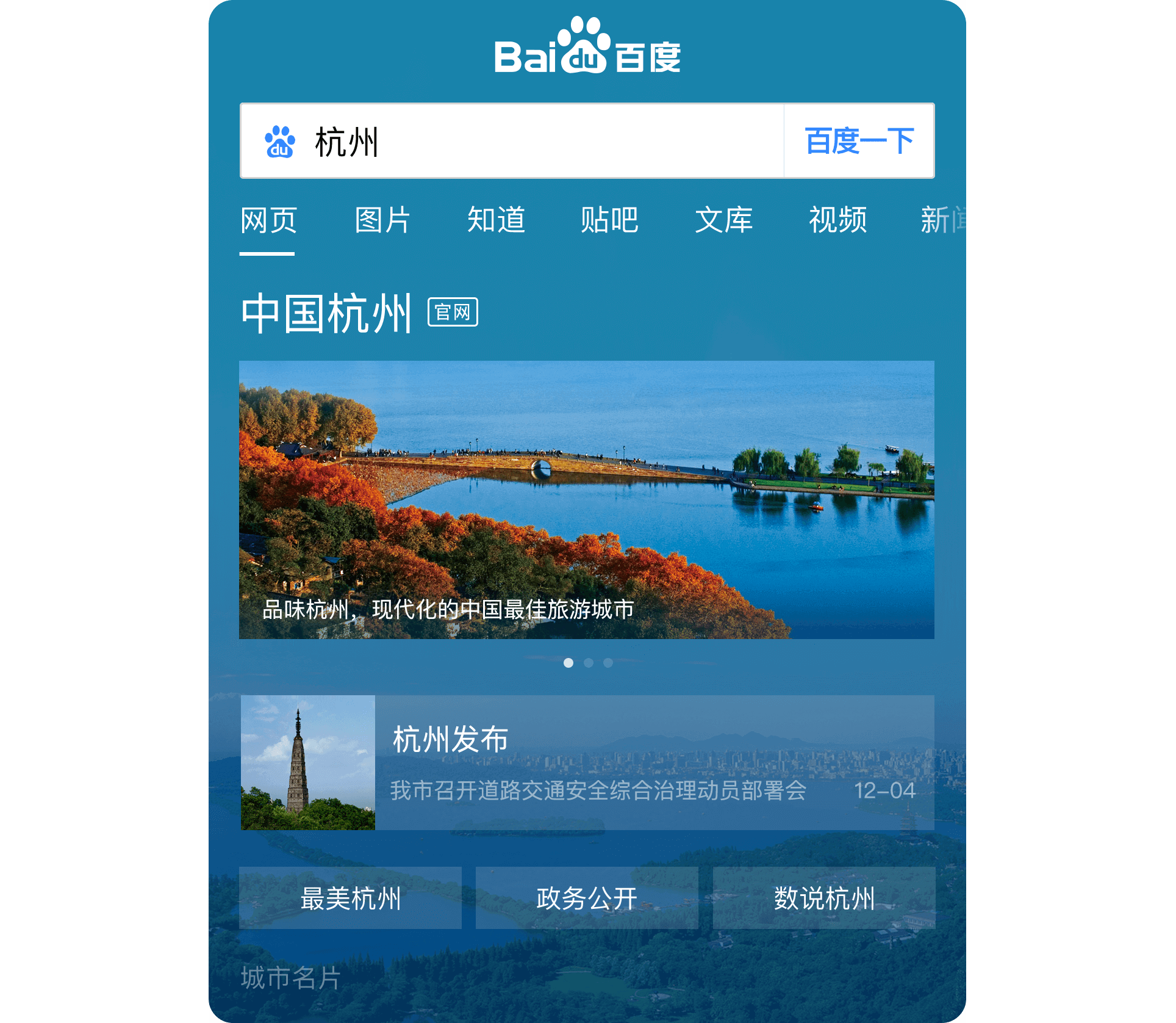 城市名片位于百度搜索結果首屏首位,更貼近政務用戶需求,同時兼具新聞性和信息屬性。以圖文、視頻等多種廣告形式全方位展示城市信息內容,有效實現(xiàn)城市形象升級、提升城市文旅影響力。