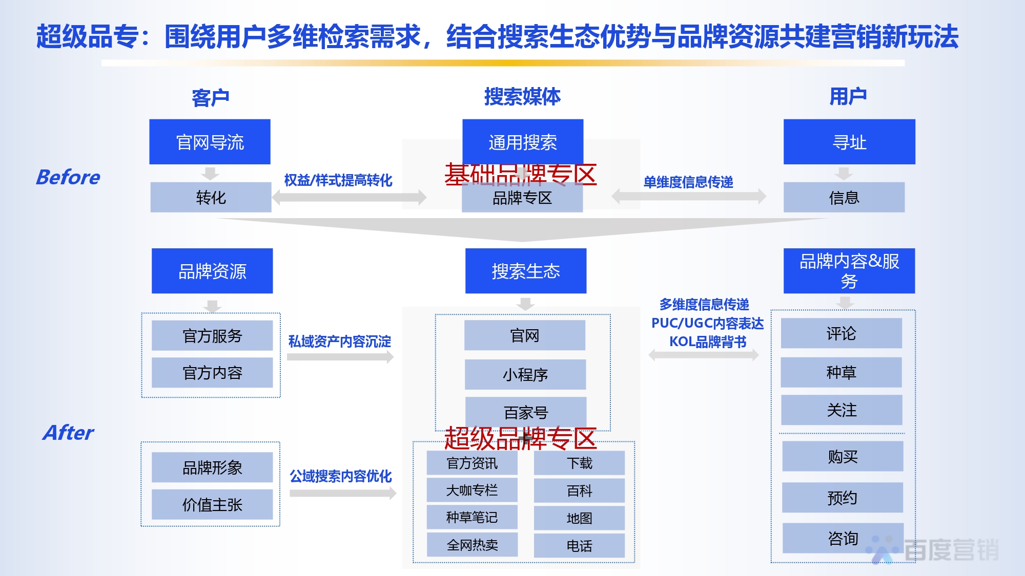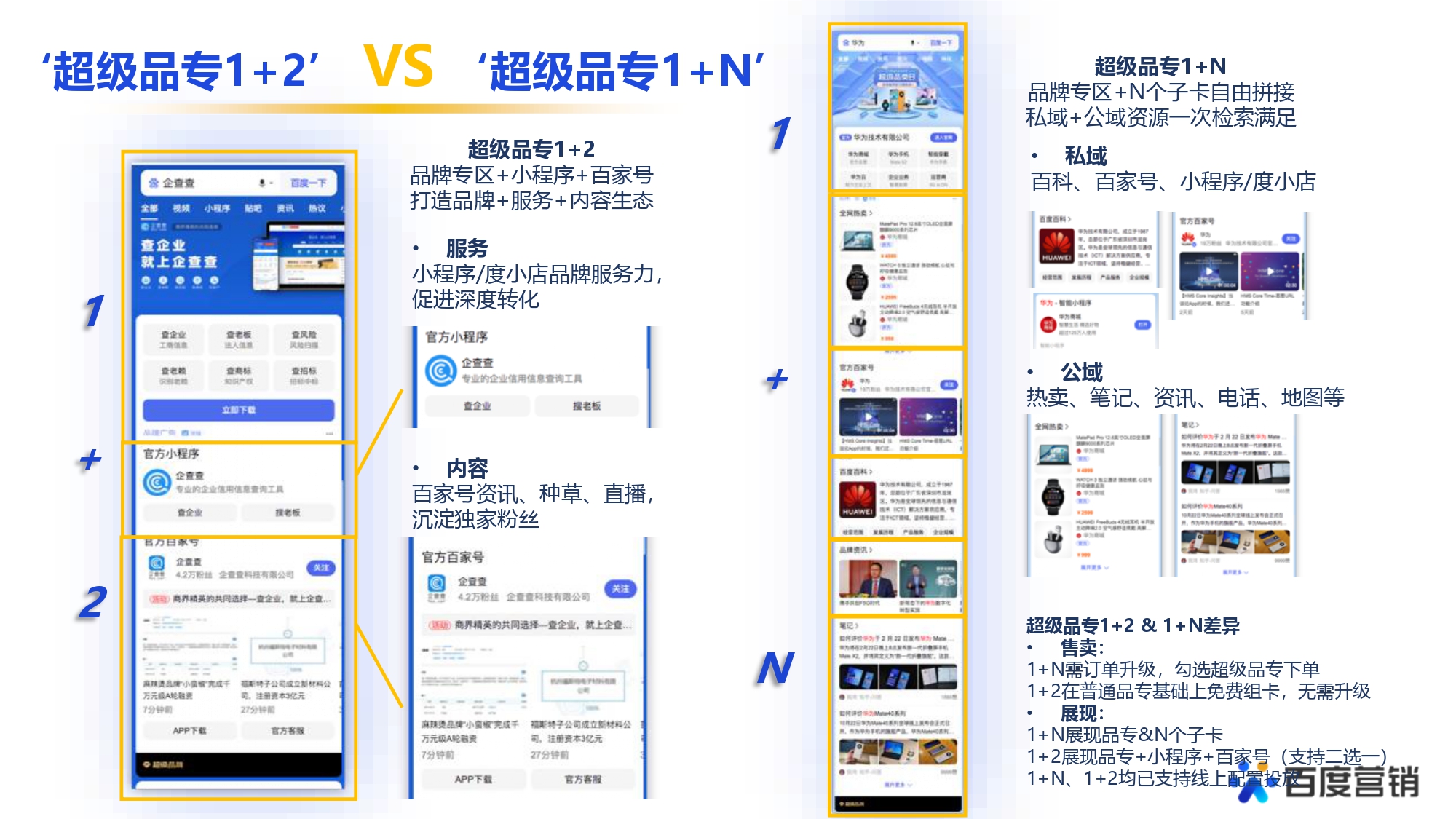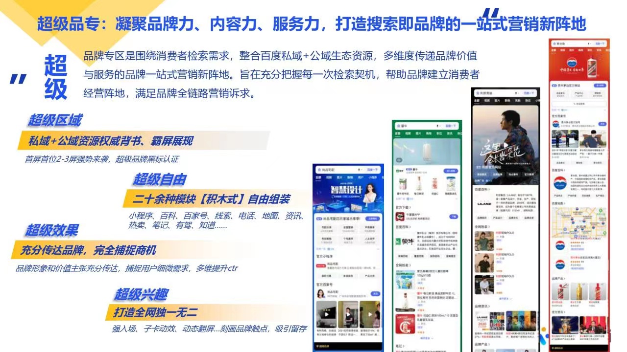 超級品專是在品牌專區(qū)基礎上推出的升級型廣告樣式,結合了百家號、小程序、視頻等其它百度系私域流量資源,將企業(yè)的品牌信息、資訊等內容展示在用戶面前,沉淀品牌的忠實用戶,提升企業(yè)品牌推廣效能。